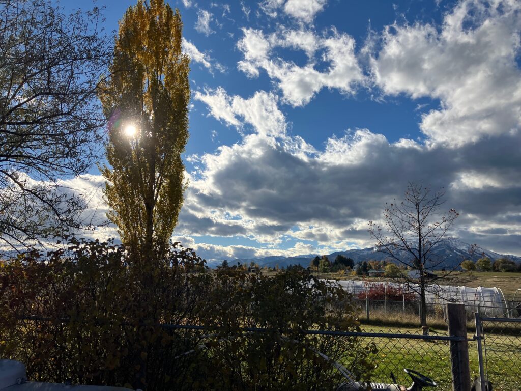 View from the window to the left of my desk, which is actually a storm door. Sapphire mountains to the east. Working on finishing two short stories, both of which have the finish line in sight. I will talk about them later.